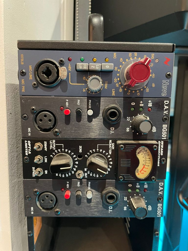 Neve 1073LB Mic Pre – “This preamp is the grandson of the legendary 1073 but in a 500 series rack! The original has been used on more hit records than anyone can imagine. Once combined with a half-decent mic it produces super clean warm vocals that hit you in the face. This was used for Teo’s vocals with a simple no-nonsense Shure SM7B Mic. Good enough for MJ, good enough for us mate.”